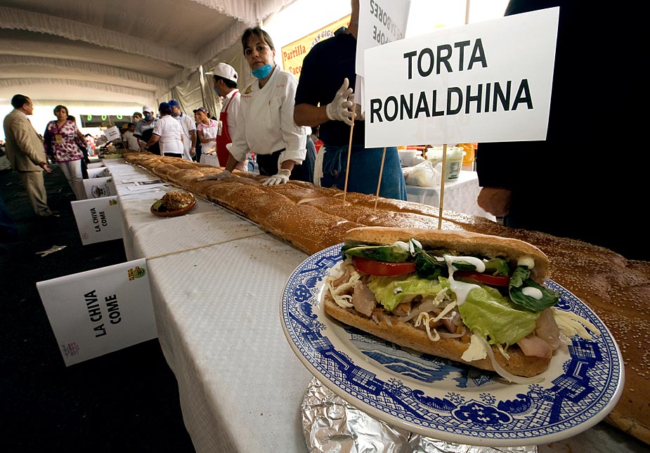 7月31日,在墨西哥首都墨西哥城舉辦的“墨西哥三明治節(jié)”上,200多人用肉、火腿、西紅柿、奶酪等各種餡料合作制成了長(zhǎng)達(dá)46米的墨西哥三明治,試圖創(chuàng)造世界最長(zhǎng)的墨西哥三明治紀(jì)錄。
