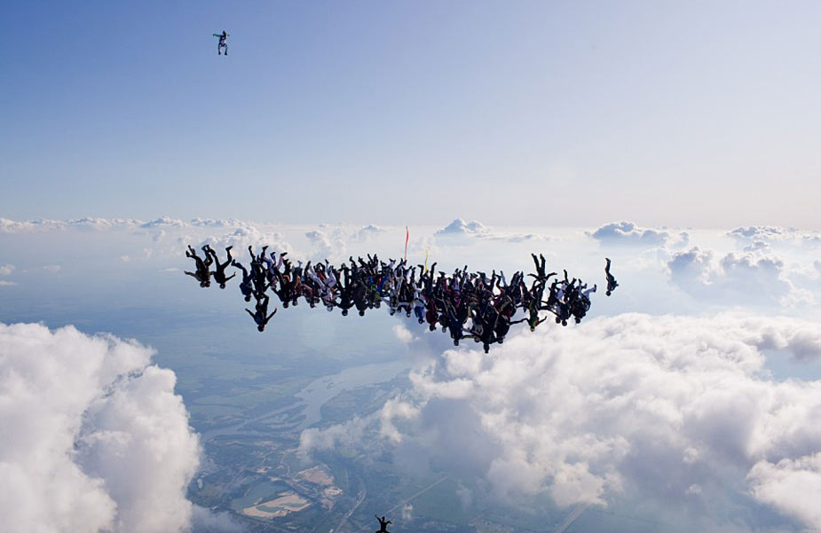 據(jù)英國媒體8月2日報道,美國上空108名傘降者從1.8萬英尺(約5.48公里)高空以180英里每小時時速跳下,并在空中組成各種圖形,欲打破世界紀錄。