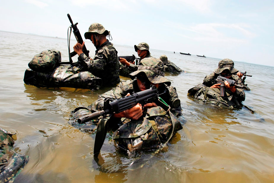 2009年8月5日,韓國特種戰(zhàn)司令部特種作戰(zhàn)分隊(duì)在南泰安郡演練海上滲透攻擊。