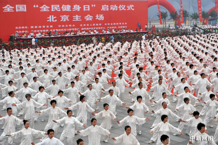 8月8日,全國首個(gè)“全民健身日”北京主會(huì)場(chǎng)啟動(dòng)儀式上,三萬多群眾進(jìn)行太極拳展示活動(dòng),在世界吉尼斯總部認(rèn)證官員的見證下成功打破世界紀(jì)錄。中新網(wǎng)記者 金碩 攝