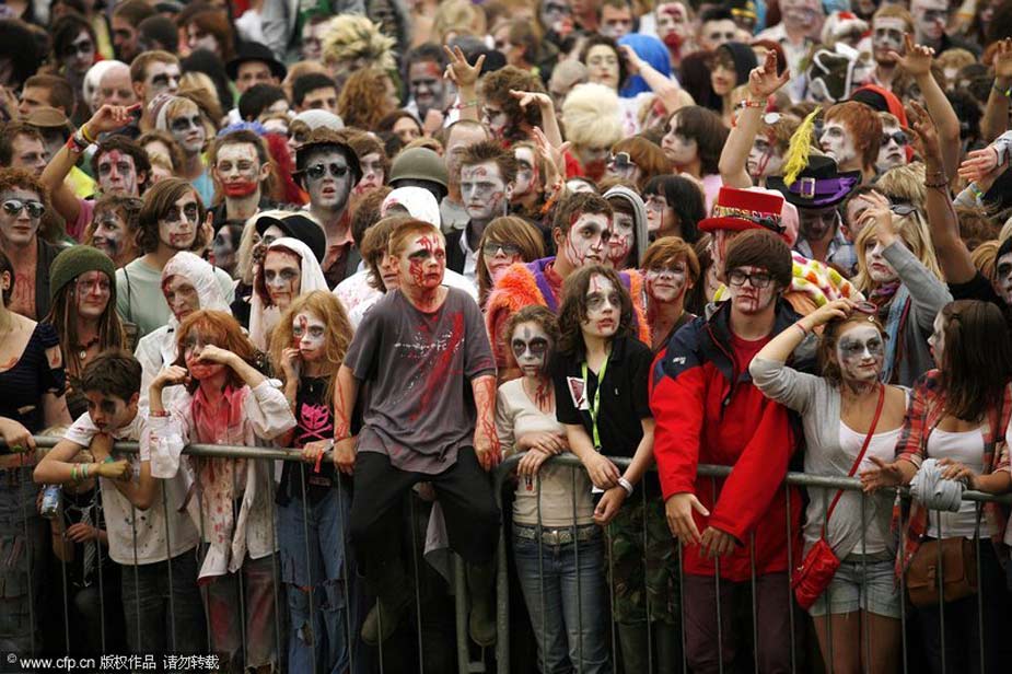 2009年8月6日,英國(guó)赫里福德郡Eastnor城堡,人們化裝成“僵尸”出現(xiàn)在大寒音樂(lè)節(jié)上,欲打破同一地點(diǎn)聚集最多“僵尸”的世界紀(jì)錄。