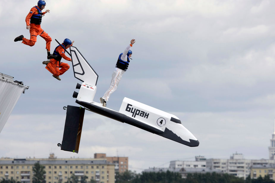 8月9日,莫斯科河畔舉辦一年一度的“墜落節(jié)”,表演者帶著自己設(shè)計制作的各種“飛行器”勇敢的從高空跳入水中。