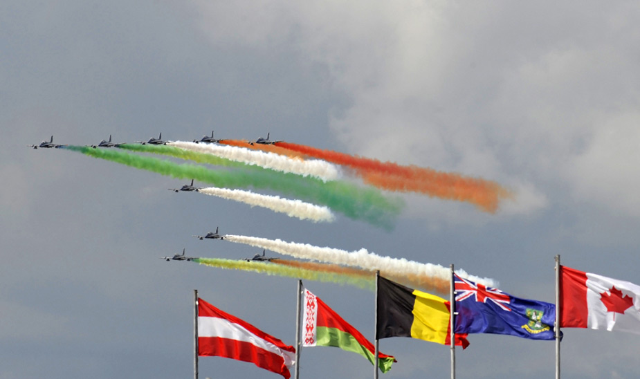 圖為意大利空軍“三色箭”飛行隊(duì)精彩的特技飛行表演。