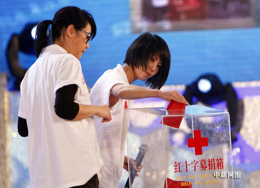 “跨越海峽的愛心”——大陸同胞援助臺灣“莫拉克”臺風(fēng)受災(zāi)同胞賑災(zāi)晚會在北京舉行。眾多文體界明星在現(xiàn)場亮相,獻(xiàn)出一片愛心。圖為劉若英、許茹蕓在晚會現(xiàn)場捐款。 中新社發(fā) 杜洋 攝