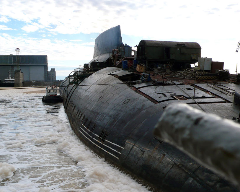 被拆解的核潛艇屬于臺(tái)風(fēng)級(jí)戰(zhàn)略核潛艇,編號(hào)TK13。2008年7月,該艇被運(yùn)抵俄羅斯北部北德文斯克的茲韋茲多奇卡(Zvezdochka)船廠。(環(huán)球網(wǎng))