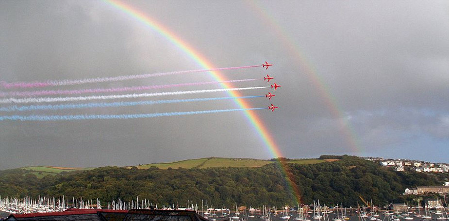 據(jù)英國媒體近日報道,英國皇家空軍“紅箭”飛行表演隊20日在英國康沃爾郡福伊港進(jìn)行飛行特技表演時,恰巧天邊出現(xiàn)一道彩虹,相映成輝,異常漂亮。