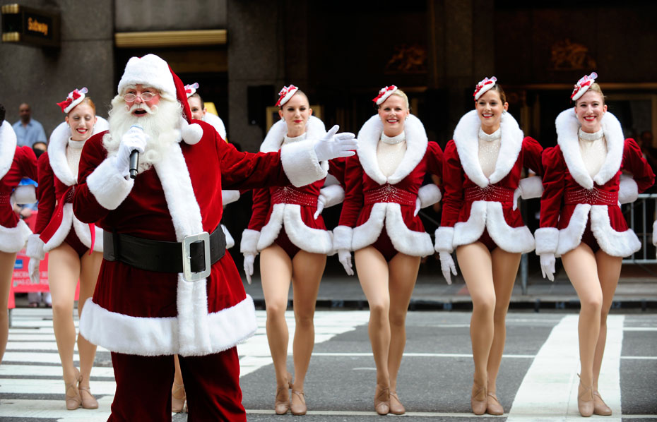 8月25日,美國“火箭女郎”舞蹈團(tuán)身著圣誕裝在無線電城音樂廳(Radio City Music Hall)前演出。來源:中國新聞網(wǎng)