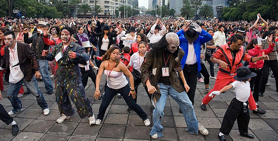8月29日,逾萬(wàn)名墨西哥人在墨西哥城廣場(chǎng)同時(shí)跳舞,用以紀(jì)念邁克爾·杰克遜第51個(gè)“生日”,同時(shí)也試圖打破同時(shí)跳舞人數(shù)最的吉尼斯世界紀(jì)錄。圖片來(lái)源:中國(guó)新聞網(wǎng)