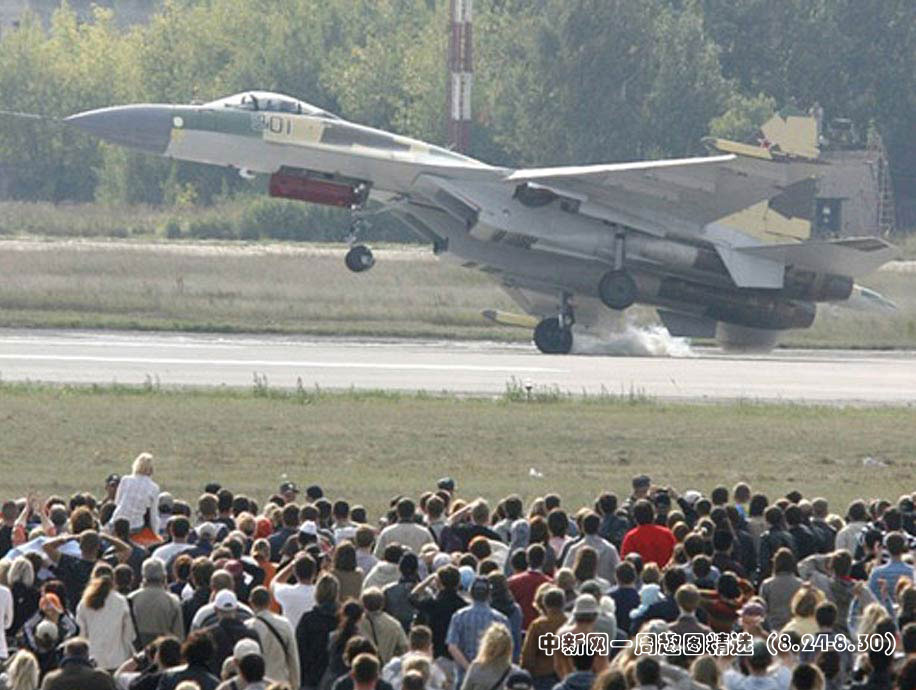 8月24日,莫斯科航展閉幕日上進(jìn)行飛行表演的蘇-35戰(zhàn)機(jī),在技能高超的飛行員駕駛下,玩起了單輪著陸特技動(dòng)作,令現(xiàn)場(chǎng)的觀眾大飽眼神。圖片來(lái)源:中國(guó)新聞網(wǎng)
