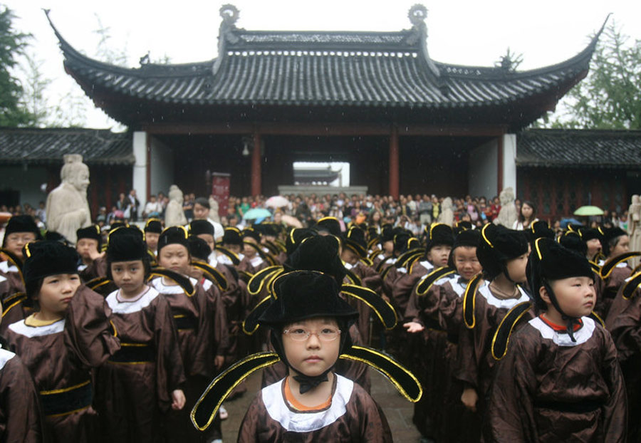 2009年8月31日,南京夫子廟小學(xué)一年級(jí)新生在南京夫子廟參加了“開筆破蒙”儀式。點(diǎn)朱砂、寫“人”字、念《論語(yǔ)》……接受傳統(tǒng)文化熏陶成為孩子們新學(xué)期的第一課。一年級(jí)新生穿著統(tǒng)一的“祭孔服”,老師們挨個(gè)在孩子們額頭點(diǎn)上朱砂痣,并送上祝福的話。點(diǎn)朱砂,又稱“開天眼”,寓意孩子從此眼明心明,好讀書,讀好書。麥兜/CFP