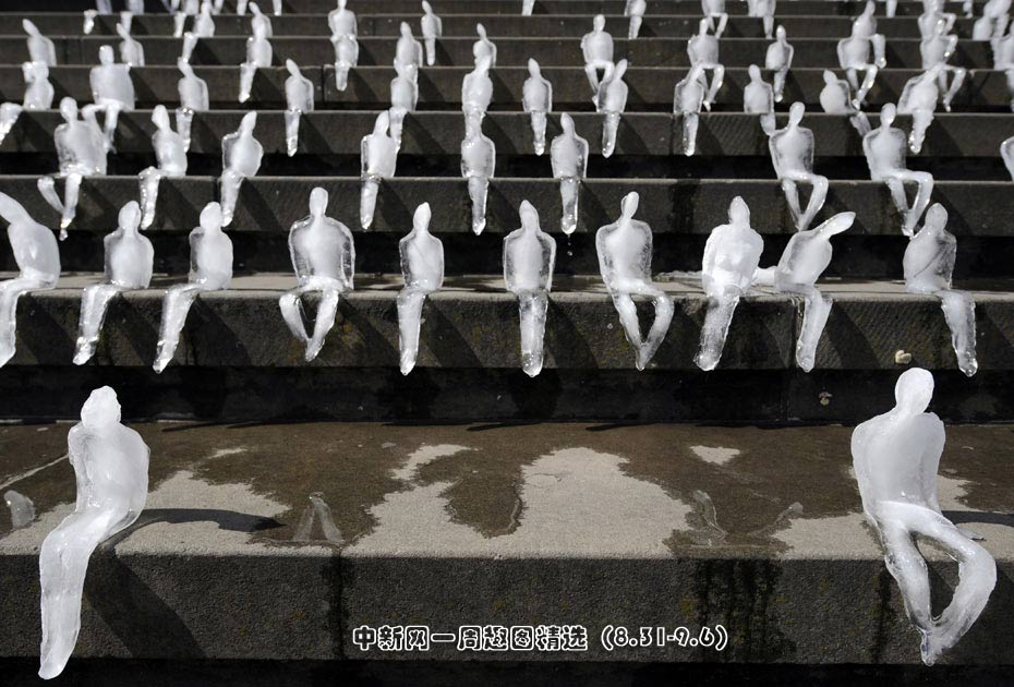 9月2日,德國(guó)柏林,世界野生動(dòng)物基金會(huì)(WWF)將1000個(gè)小冰人被放置在了御林廣場(chǎng)音樂(lè)廳的臺(tái)階上,小冰人慢慢融化成水。圖片來(lái)源:中國(guó)新聞網(wǎng)