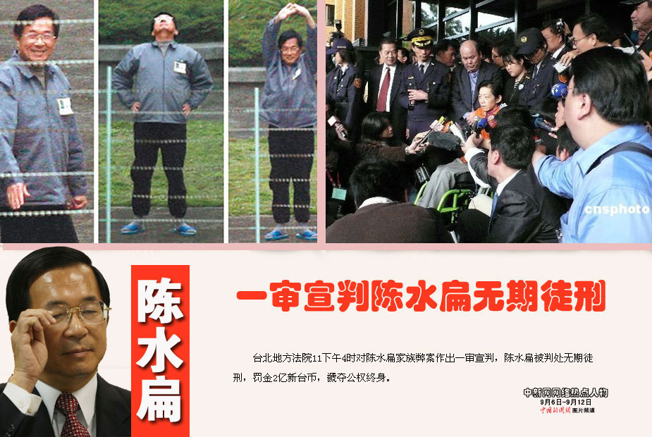 中新網(wǎng)本周熱點(diǎn)人物之——陳水扁 臺(tái)北地方法院11下午4時(shí)對(duì)陳水扁家族弊案作出一審宣判,陳水扁被判處無(wú)期徒刑,罰金2億新臺(tái)幣,褫奪公權(quán)終身。