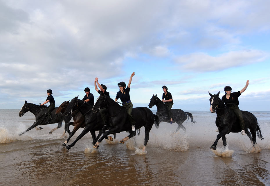 9月16日,英國皇家騎兵團(tuán)在英格蘭黑池附近的海水中暢游。在日常儀式職責(zé)之余,騎兵團(tuán)帶著馬匹來這里放松休息。圖片來源:中國新聞網(wǎng)