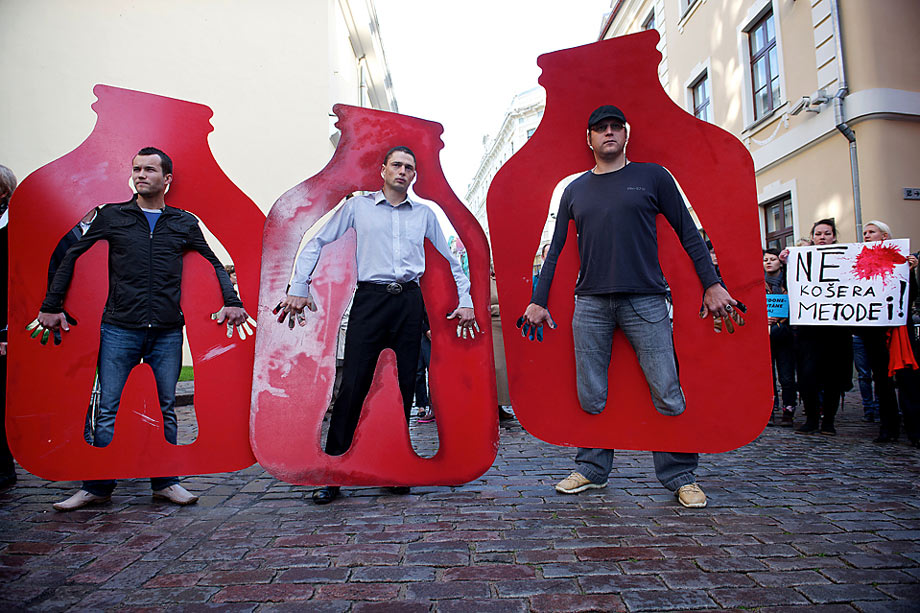 9月17日,在拉脫維亞首都里加,抗議者舉行示威游行活動,反對屠宰動物。圖片來源:中國新聞網(wǎng)