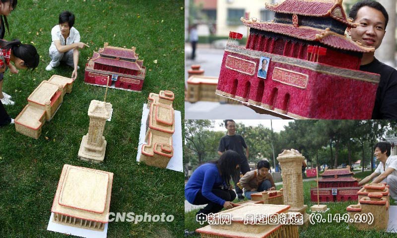 為迎接祖國60華誕,四川青年理發(fā)師黃鑫用40多公斤碎頭發(fā)制作了一個(gè)微型“天安門廣場(chǎng)”全景模型。圖片來源:中國新聞網(wǎng)