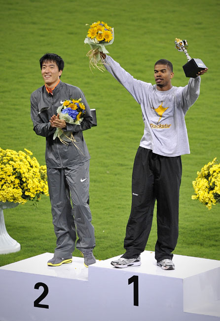圖為領(lǐng)獎(jiǎng)臺(tái)的翔飛人。在20日晚進(jìn)行的上海田徑大獎(jiǎng)賽的男子110米欄的比賽中,劉翔時(shí)隔13個(gè)月后重返賽場,并跑出13秒15的成績。美國名將特拉梅爾以13秒15的同樣成績、近乎為零的優(yōu)勢奪走冠軍。