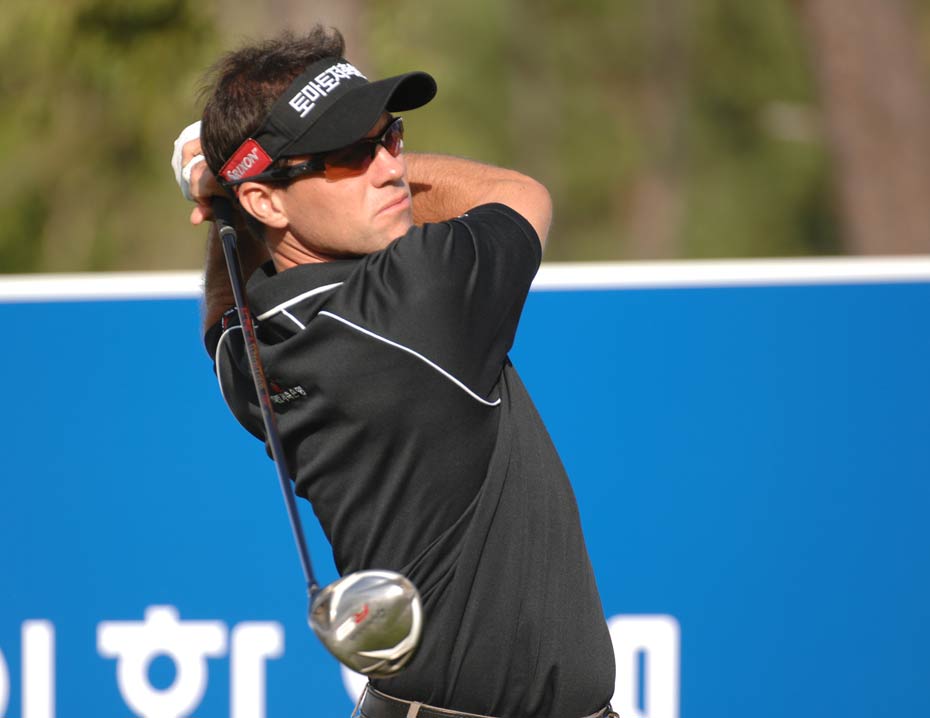 2009“韓國KEB銀行”中韓職業(yè)高爾夫球巡回賽韓國站于今天在韓國OSTAR高爾夫球俱樂部正式開桿,有47名球員代表中國參賽。圖為選手們上場第一天,揮桿開打的場面。
