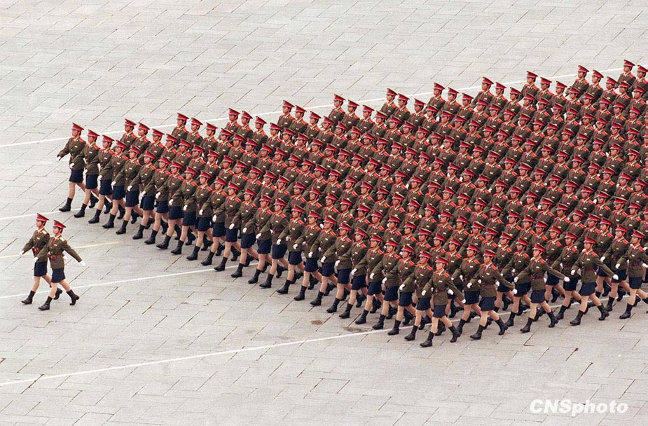 由白求恩軍醫(yī)學(xué)院學(xué)員組成的女兵方隊,邁著整齊的步伐經(jīng)過天安門城樓。該校曾經(jīng)組建中國閱兵史上的第一支女兵方隊參加國慶三十五周年的首都閱兵慶典。中新社發(fā) 任晨鳴 攝