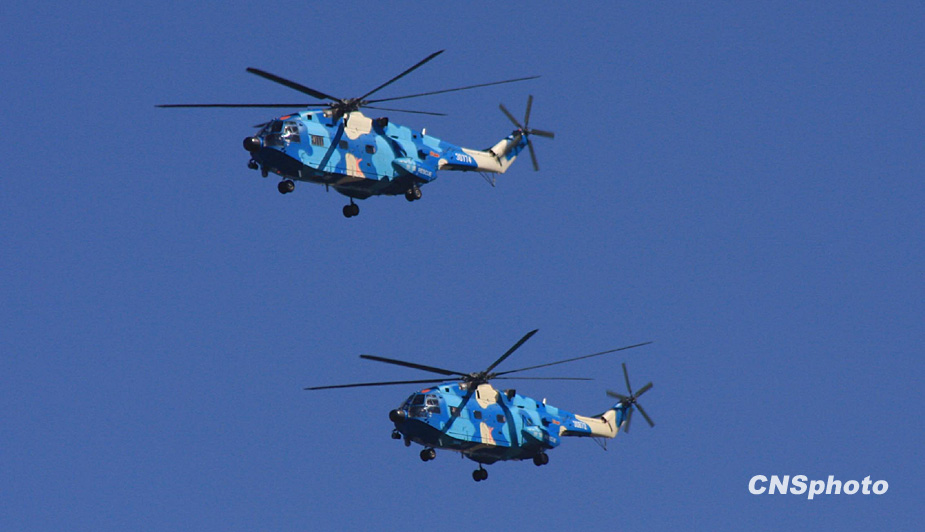 2009年10月1日,中華人民共和國(guó)成立60周年慶祝大會(huì)在北京天安門廣場(chǎng)舉行。圖為搜救、運(yùn)輸直升機(jī)梯隊(duì)。中新社發(fā) 郭國(guó)權(quán) 攝