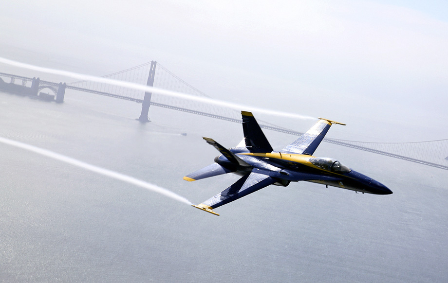 2009年10月8日,美軍飛機(jī)在舊金山灣上空進(jìn)行飛行演練。一年一度的舊金山艦隊(duì)周將于10月10日開幕,屆時(shí)會有船艦游行和飛行表演等活動。 來源:中國新聞網(wǎng)