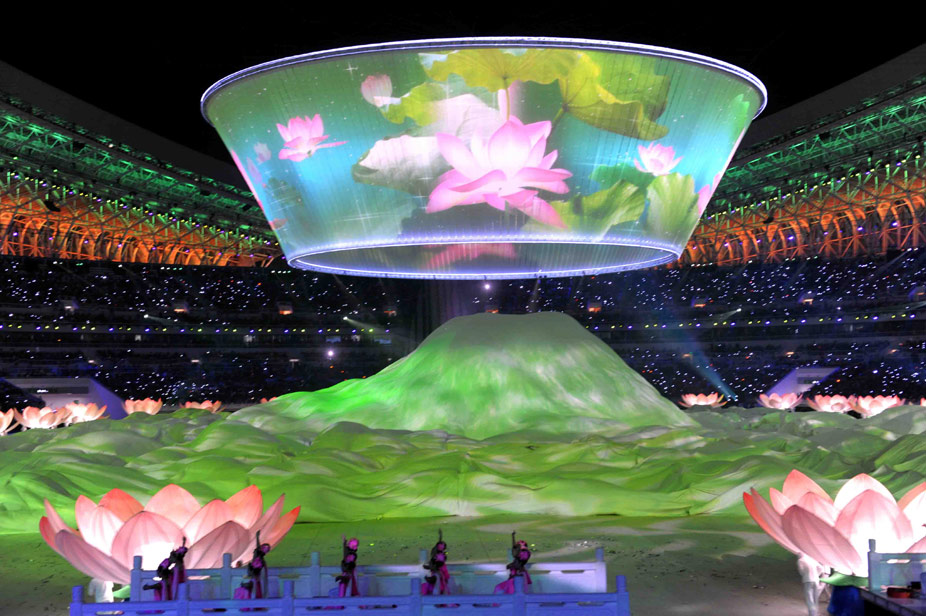 十月十六日晚,中華人民共和國第十一屆運動會在山東濟南奧體中心隆重開幕。圖為文藝晚會上的“巨碗”視頻演繹和平、和諧。中新社發(fā) 陳文 攝