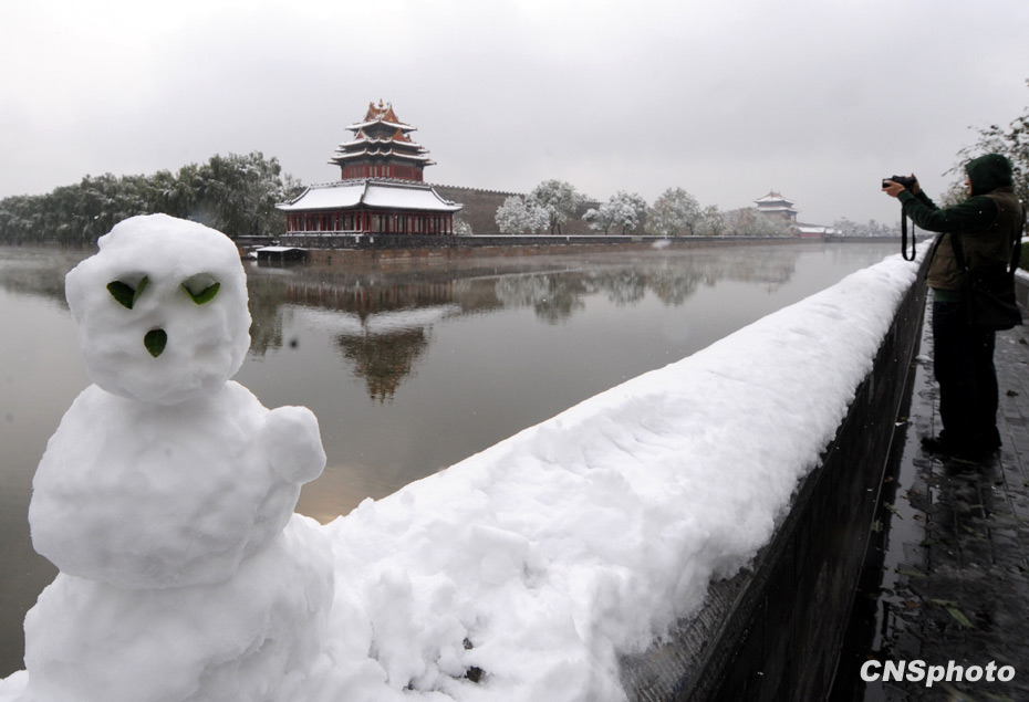 11月1日,深秋的北京大雪紛飛銀裝素裹,人們在故宮護城河邊做起雪人。中新社發(fā) 廖攀 攝