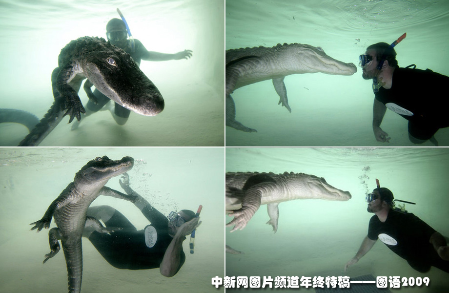 在美國(guó)佛州叢林島動(dòng)物主題公園,男子與一條美洲鱷在水下上演“人鱷共舞”。