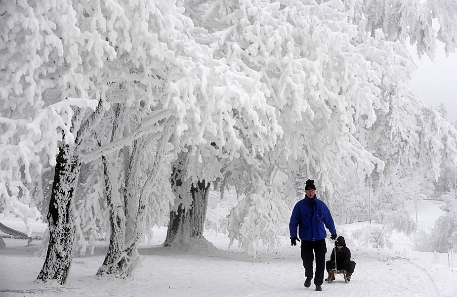 12月16日,德國阿爾滕貝格人們在雪中嬉戲。