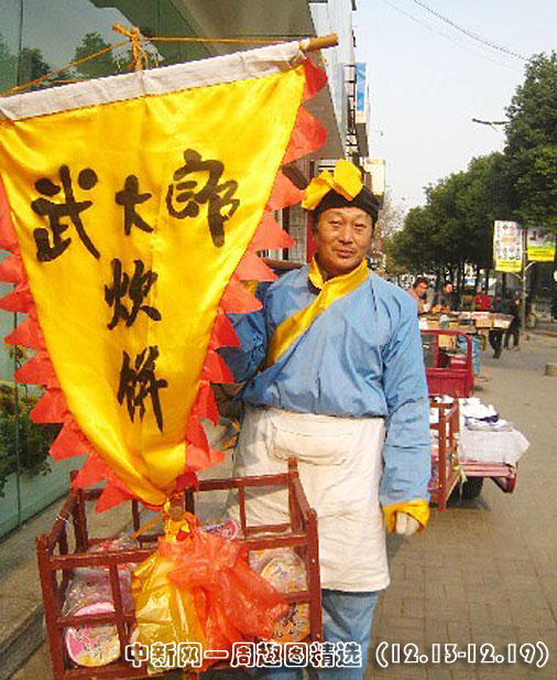 12月18日,46歲的山東省陽谷縣李振生,身著青衣襟、白圍裙、黃頭巾,肩挑貨擔(dān)裝扮成武大郎的模樣在南京街頭走街串巷賣炊餅。圖片來源:中國新聞網(wǎng)>>點(diǎn)擊觀看詳細(xì)內(nèi)容