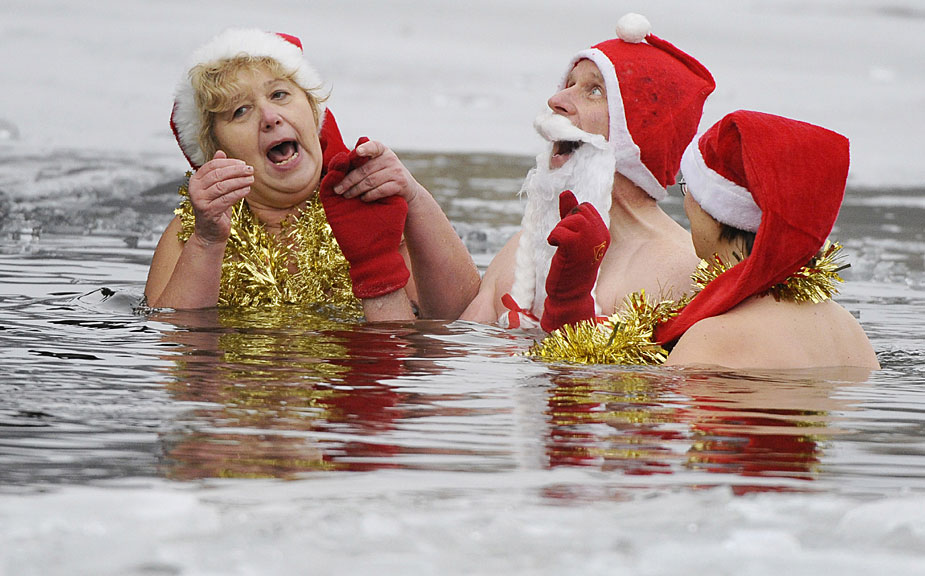 12月25日,德國(guó)柏林的冬泳俱樂部“柏林海豹”(Berliner Seehunde)的成員不畏寒冬,光著身子在已經(jīng)結(jié)冰的Oranke湖中暢游一番。圖片來源:中國(guó)新聞網(wǎng)