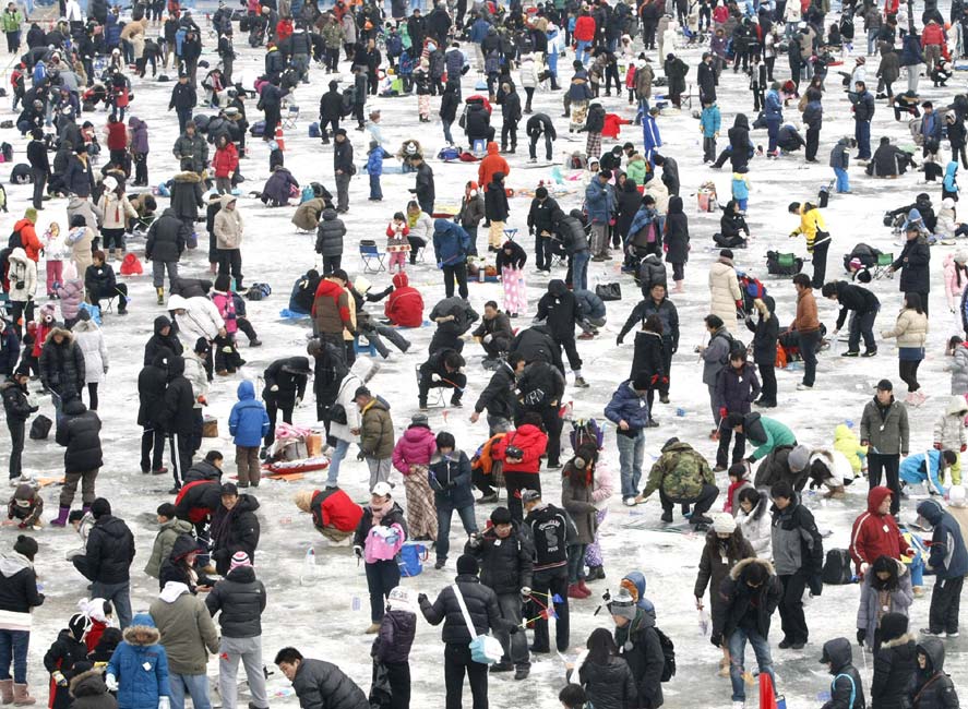 2010年1月9日,韓國華川郡,一年一度的華川山鱒魚節(jié)當(dāng)日舉行。數(shù)千游客在此“破冰”比賽釣鱘魚。該活動每年都會吸引上百萬游客前來。