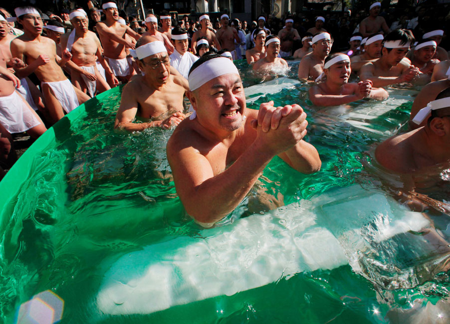 2010年1月10日,日本東京,眾多健身愛好者一同在冷水中浸泡,祈禱自己在新一年身體健康,并展示自己的體魄。