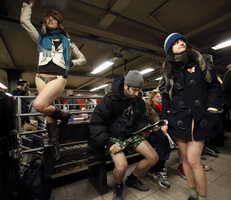 2010年1月10日,紐約,地鐵里一群不穿褲子的乘客。第9屆“不穿褲子乘地鐵”活動當(dāng)日在全球16個國家的44座城市舉行。圖片來源:中國新聞網(wǎng)
