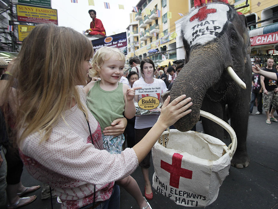 1月21日,在泰國首都曼谷舉辦了一場(chǎng)大象為海地災(zāi)區(qū)募捐活動(dòng)。人們紛紛向大象攜帶的籃子內(nèi)放入善款,向海地地震幸存者獻(xiàn)上一份愛心。圖片來源:中國新聞網(wǎng)