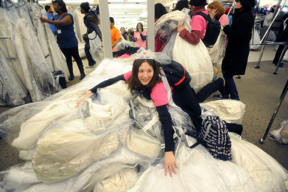 近日,美國紐約一年一度的“新娘快跑”婚紗促銷活動舉行。千余名來自全美各地的準(zhǔn)新娘和親朋好友,早早就在門口等候,平時上千美元婚紗只需要五分之一的價格就能帶回家。圖片來源:中國新聞網(wǎng)
