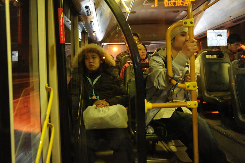 圖為在公交車上,疲憊的邵帥望著窗外。朱嘉磊/CFP