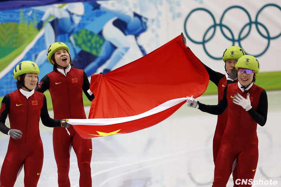 當(dāng)?shù)貢r(shí)間2月24日,溫哥華冬奧會(huì)女子短道速滑3000米接力A組決賽中,中國(guó)隊(duì)王濛、周洋、孫琳琳、張會(huì)四朵金花聯(lián)袂出擊,最終將金牌歸入中國(guó)隊(duì)囊中。圖片來(lái)源:中國(guó)新聞網(wǎng)