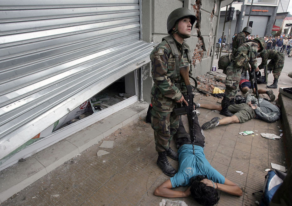 3月2日,智利軍警在街頭維持秩序。智利總統(tǒng)巴切萊特當(dāng)日說,政府派往災(zāi)區(qū)維持治安的軍人數(shù)量已達(dá)14000人,地震重災(zāi)區(qū)的搶劫現(xiàn)象已得到控制。圖片來(lái)源:中國(guó)新聞網(wǎng)