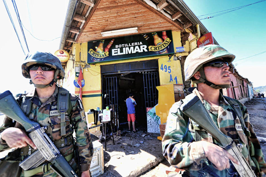 智利總統(tǒng)巴切萊特當(dāng)日說(shuō),政府派往災(zāi)區(qū)維持治安的軍人數(shù)量已達(dá)14000人,地震重災(zāi)區(qū)的搶劫現(xiàn)象已得到控制。圖片來(lái)源:中國(guó)新聞網(wǎng)
