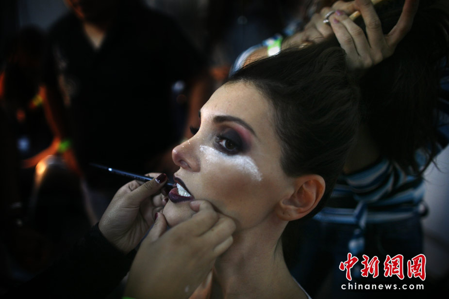 4月13日,墨西哥首都墨西哥城奔馳時裝周,美模們在臺前展現(xiàn)靚麗風采,后臺則讓我們看到了完全不同的世界。