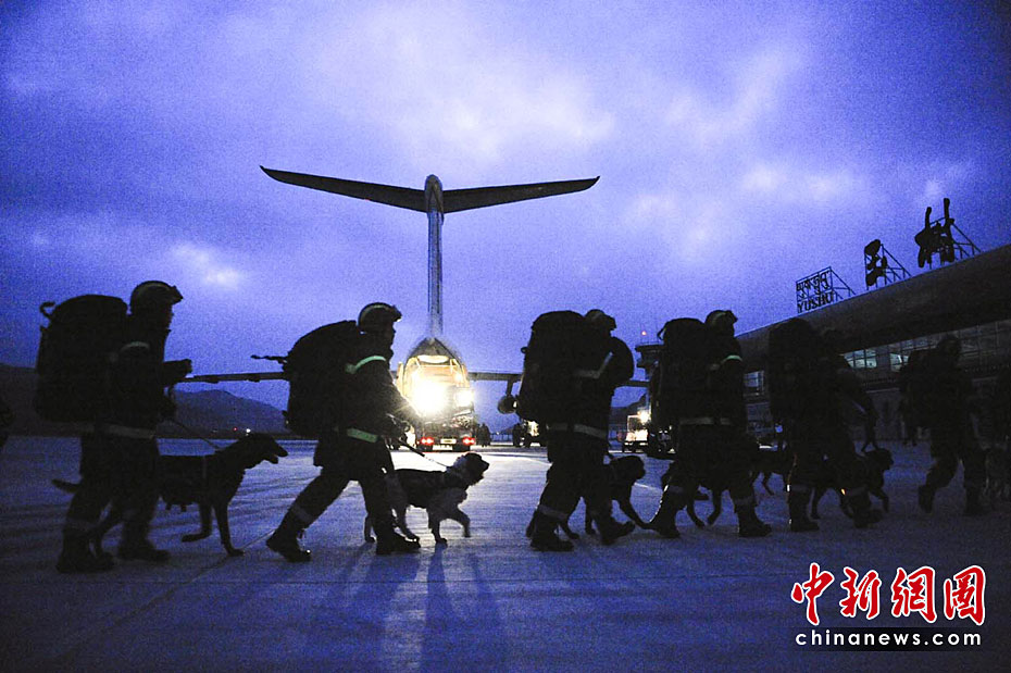 圖為4月14日20點(diǎn)20分,中國(guó)國(guó)際地震救援隊(duì)抵達(dá)玉樹(shù)機(jī)場(chǎng)。中新社發(fā) 廖攀 攝