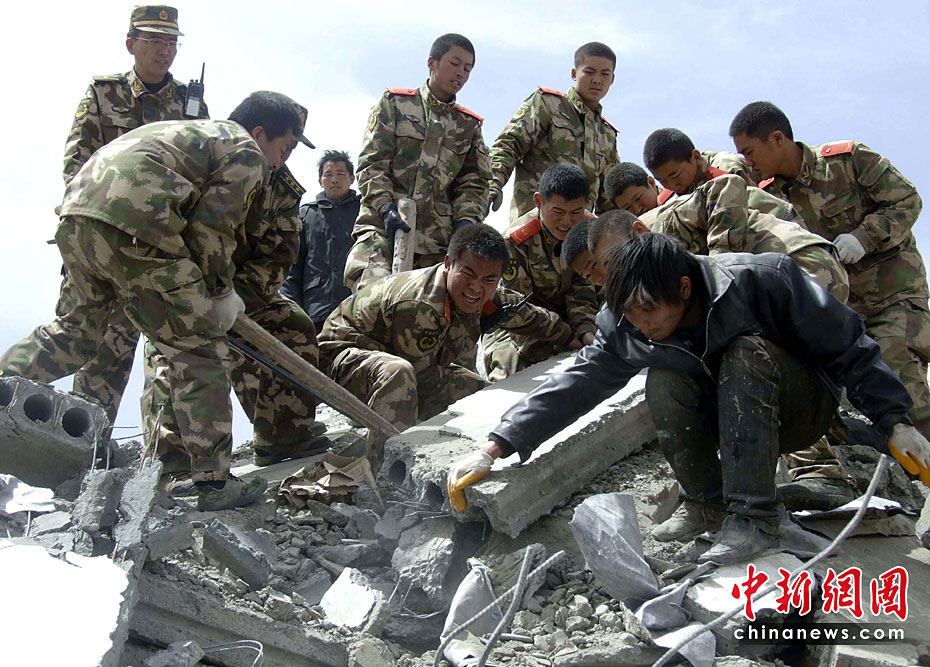 圖為4月14日,武警玉樹支隊的戰(zhàn)士和玉樹當(dāng)?shù)孛癖姽餐仍焕У拿癖。中新社發(fā) 于文群 攝