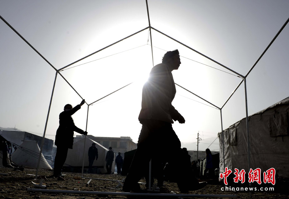 4月15日,青海玉樹縣體育場的地震災民安置點內(nèi),玉樹地震災民正在積極自建抗震帳篷。中新社發(fā) 廖攀 攝