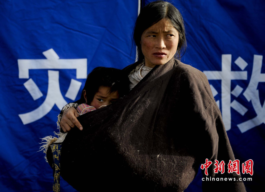 4月15日,青海玉樹縣體育場(chǎng)的地震災(zāi)民安置點(diǎn)內(nèi),一位母親懷抱小女兒等待醫(yī)治女兒的腳傷。中新社發(fā) 廖攀 攝