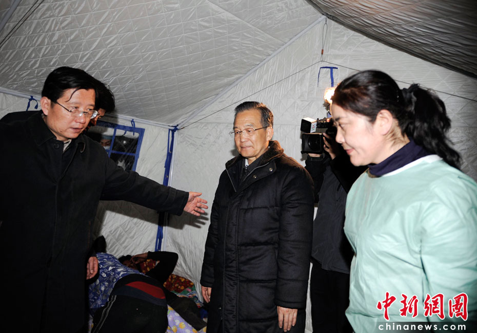 4月15日20時(shí),中國(guó)國(guó)務(wù)院總理溫家寶來到青海省玉樹縣玉樹自治州醫(yī)院看望受災(zāi)民眾。溫總理看望完受災(zāi)民眾后表情凝重。中新社發(fā) 廖攀 攝
