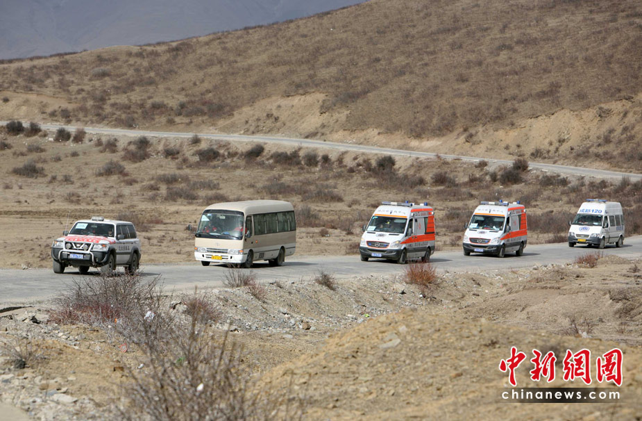 4月16日,四川省衛(wèi)生廳從成都派出首支國家醫(yī)療救援隊(duì)經(jīng)過1200余公里,40小時(shí)的長途跋涉,醫(yī)療救援車隊(duì)平安抵達(dá)青海省玉樹地震重災(zāi)區(qū)。圖為醫(yī)療車隊(duì)正在翻越海拔5000多米的海子山。中新社發(fā) 劉忠俊 攝