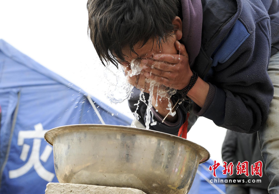 4月16日,青海玉樹體育場(chǎng)地震受災(zāi)民眾安置點(diǎn),一位居民用清水洗臉。隨著救災(zāi)物資的到位,受災(zāi)民眾生活得到基本保障。 中新社發(fā) 廖攀 攝