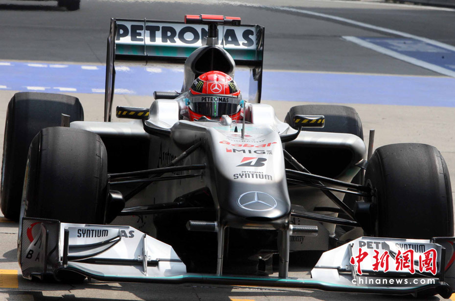 4月16日,2010國際汽聯(lián)F1世界錦標賽上海站在上海國際賽車場開始車手第一、第二次練習賽。圖為代表梅賽德斯GP車隊出戰(zhàn)的老車王、德國車手舒馬赫重回上海賽道。 中新社記者 任晨鳴 攝