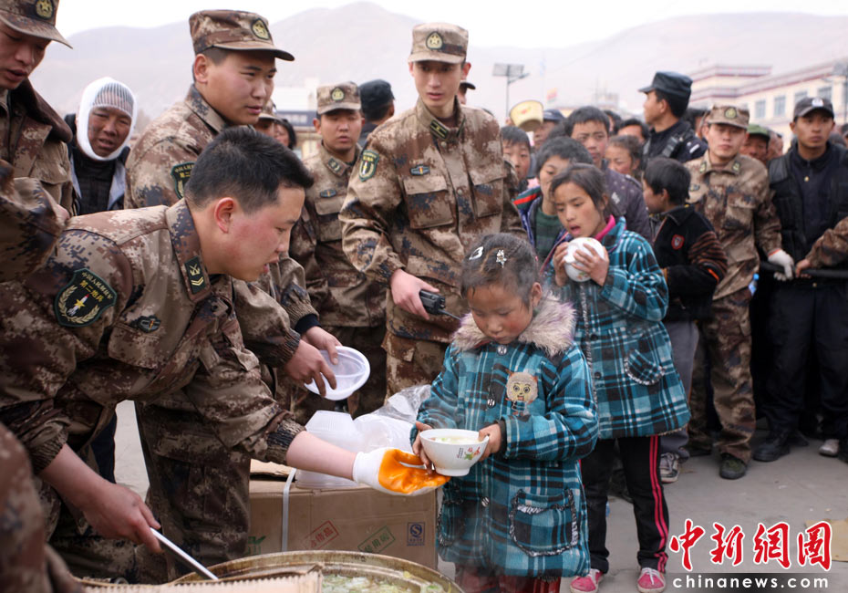 4月16日,青海省玉樹藏族自治州玉樹縣地震發(fā)生第三天,為確保災(zāi)民有飯吃、有帳篷住,玉樹城內(nèi)各個安置點(diǎn)架起鍋灶為受災(zāi)民眾分發(fā)免費(fèi)食物并幫助搭建帳篷。4月14日07時49分許,青海省玉樹藏族自治州玉樹縣(北緯33.1,東經(jīng)96.7)發(fā)生7.1級地震。中新社發(fā) 劉忠俊 攝