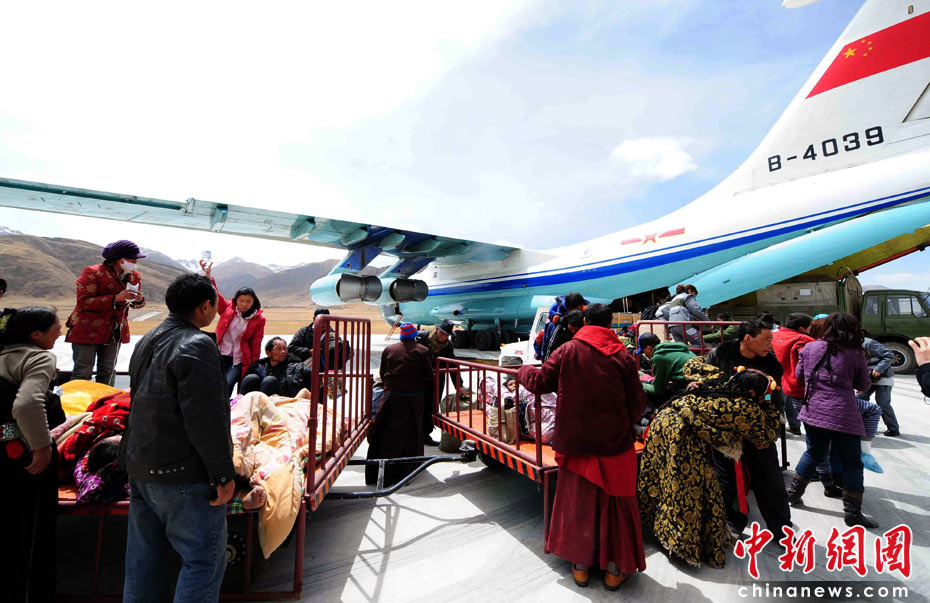 4月16日15時(shí),青海玉樹機(jī)場,149名藏族重傷員準(zhǔn)備乘坐廣空運(yùn)輸航空兵某師兩架伊爾-76型運(yùn)輸機(jī)飛往格爾木機(jī)場。中新社發(fā) 沈玲 攝